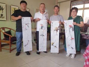 王英老师(右四)赠送(左一友人)的四条屏书画作品以细腻的笔触和丰富的色彩,生动展现了春、夏、秋、冬各自季节的独…